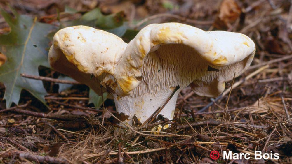 Plus difficile à trouver que les chanterelles, l’hydne sinué ou communément appelé pied-de-mouton est un très bon comestible et facile à identifier. C’est un champignon dit à aiguillons, c’est-à-dire qu’il n’a pas de lamelles, mais des petits tubes. Sa couleur et sa forme sont également facilement identifiables.