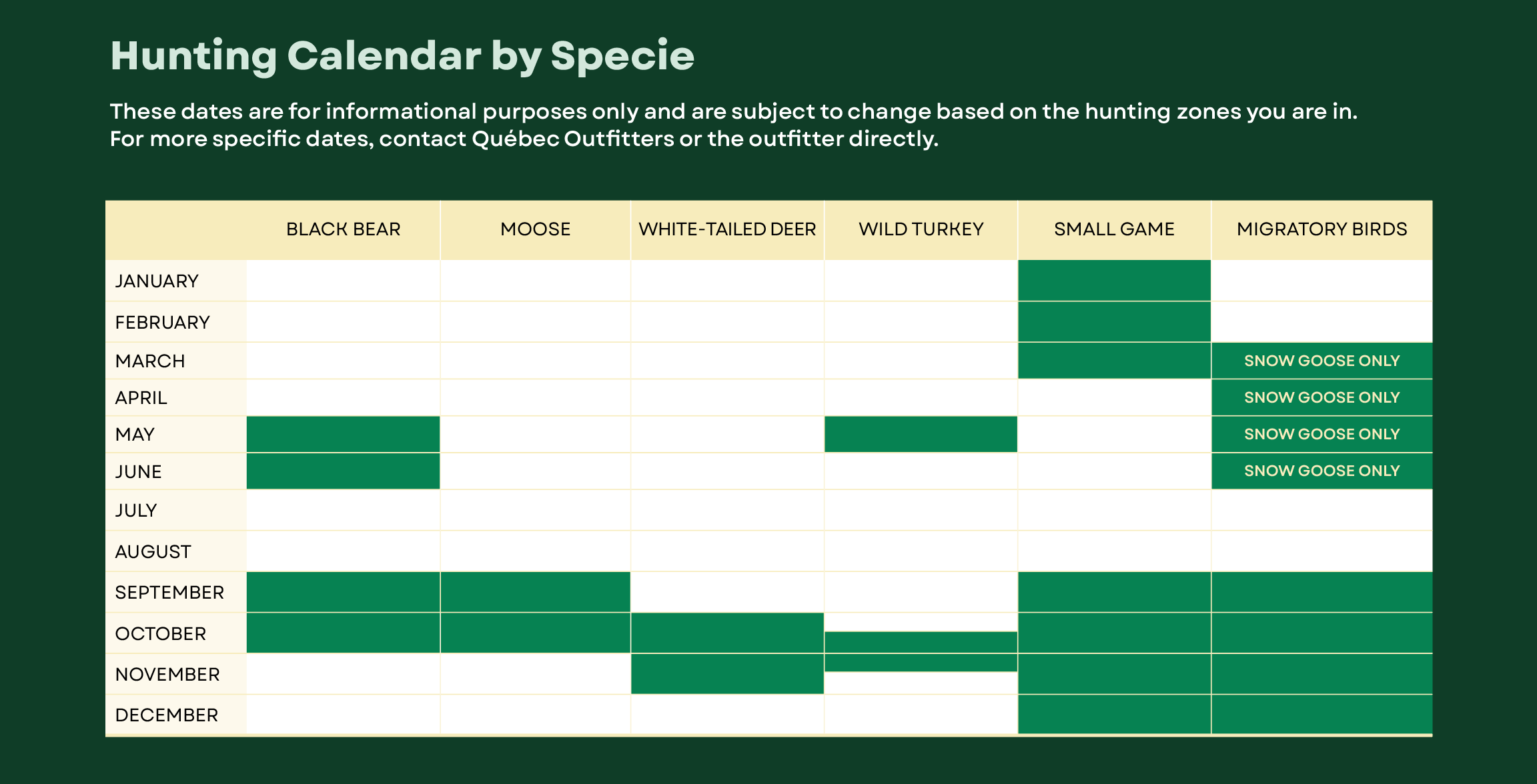 The exact hunting season dates change each year, so be sure to consult the Quebec ministry’s resources when planning your trip.
